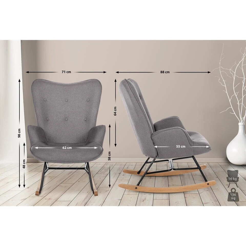 De schommelstoel Sanka is een comfortabele, solide en tegelijkertijd stijlvolle stoel voor dagelijks gebruik. Dit moderne meubelstuk past perfect in bijna elke huiskamersfeer. De comfortabel gestoffeerde zitschaal met stoffen bekleding belooft een aangenaam zitcomfort. De knopen op de bekleding van de rugleuning zetten modieuze accenten. De elegant gevormde beukenhouten lopers zijn geschroefd op een hoogwaardig zwart gelakt metalen frame, dat de stoel zijn hoge stabiliteit geeft. Een allround mooi meubelstuk waar u lang van zult genieten.