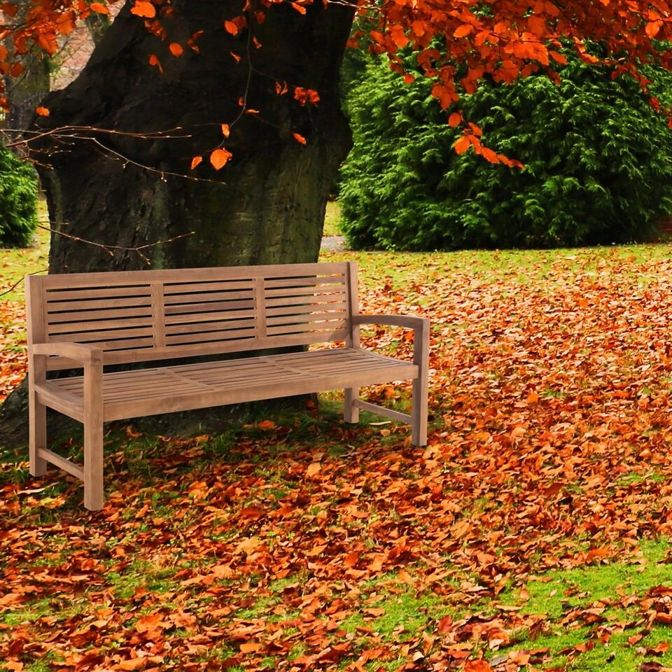 Met deze solide bank van massief teakhout kunt u heerlijk ontspannen en genieten van de natuur. Het uiterst hoogwaardige en duurzame materiaal is ontworpen voor comfortabel zitten. Mooie details zijn het tijdloze ontwerp van de spijlen, de licht gebogen zitting en de aangenaam schuin geplaatste rugleuning. De comfortabele armleuningen ronden het totaalplaatje af. De stabiele poten zijn gemaakt van 6×6 cm dik massief hout. Teakhouten tuinmeubelen kunnen het hele jaar door buiten blijven staan. Voor het behoud van de kleur worden geschikte onderhoudsolie voor teak aanbevolen, die u desgewenst bij de vakhandel kunt verkrijgen.