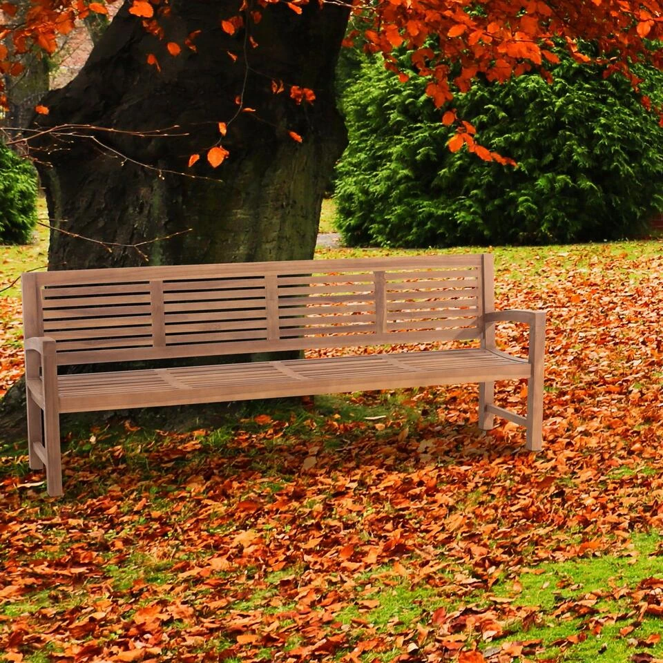 Met deze solide bank van massief teakhout kunt u heerlijk ontspannen en genieten van de natuur. Het uiterst hoogwaardige en duurzame materiaal is ontworpen voor comfortabel zitten. Mooie details zijn het tijdloze ontwerp van de spijlen, de licht gebogen zitting en de aangenaam schuin geplaatste rugleuning. De comfortabele armleuningen ronden het totaalplaatje af. De stabiele poten zijn gemaakt van 6×6 cm dik massief hout. Teakhouten tuinmeubelen kunnen het hele jaar door buiten blijven staan. Voor het behoud van de kleur worden geschikte onderhoudsolie voor teak aanbevolen, die u desgewenst bij de vakhandel kunt verkrijgen.