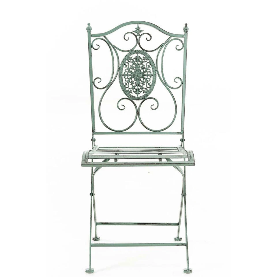 Klapbare ijzeren tuinstoel Sibell, een exclusieve eyecatcher voor elk terras en tuin. De delicate vorm en liefdevol handgemaakte details maken deze stoel uniek en zorgen voor een nostalgische uitstraling.
