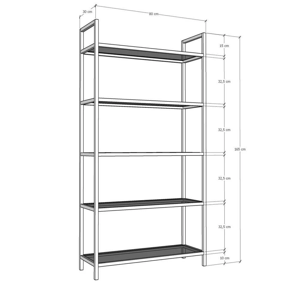 Met een breedte van 80 cm, hoogte van 165 cm en diepte van 30 cm biedt deze boekenplank voldoende ruimte om uw favoriete boeken, foto’s en decoratieve items tentoon te stellen. De talrijke planken bieden voldoende opbergruimte, terwijl de draagcapaciteit van de planken van 35 kg ervoor zorgt dat u zelfs uw zwaarste items veilig kunt tentoonstellen.