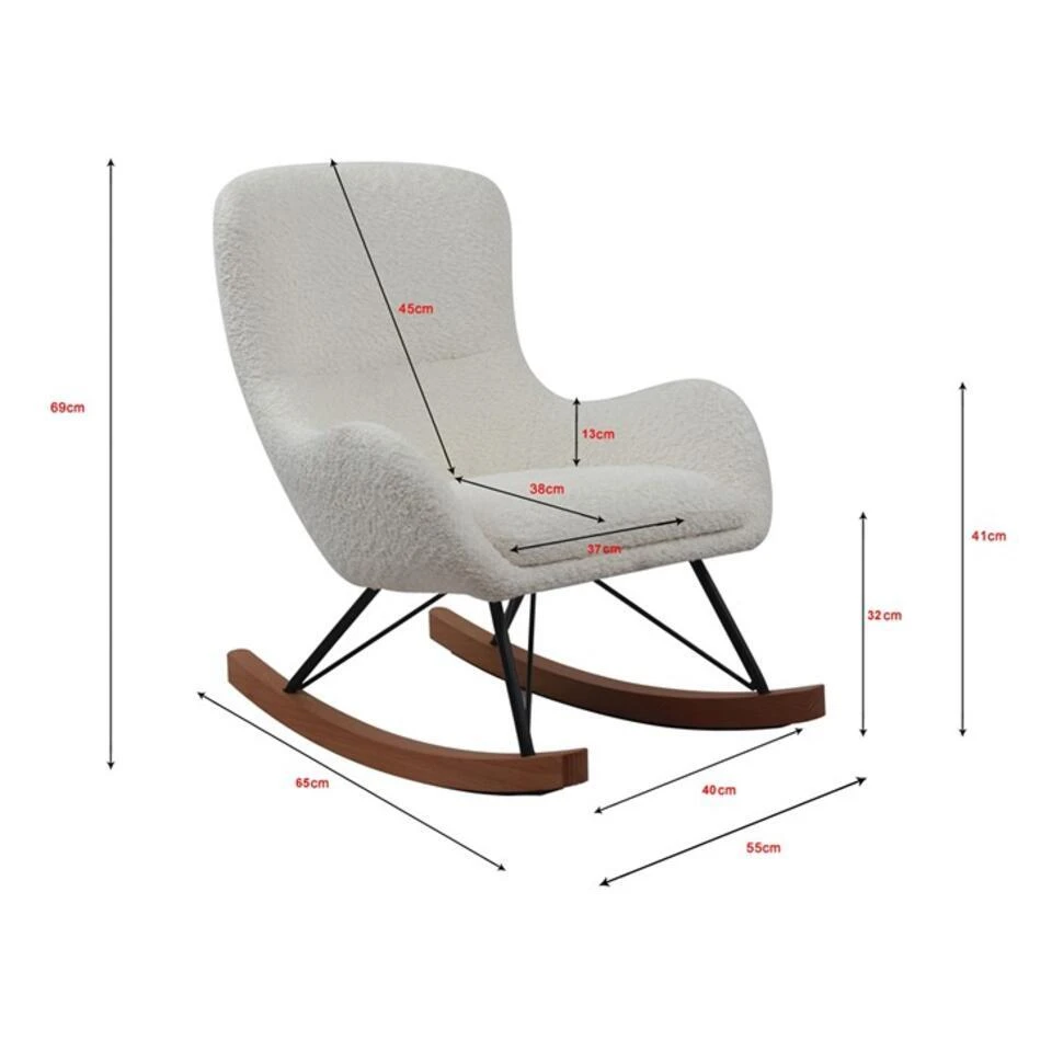 Wieg jezelf naar de zevende hemel met schommelstoel Rocky! Gehuld in witte bouclé-stof van topkwaliteit, biedt deze stoel niet alleen een luxe-uitstraling, maar ook een ongeëvenaard gevoel van zachtheid. Deze stof is bovendien heel eenvoudig schoon te maken, waardoor je onbezorgd kan snacken in de Rocky schommelstoel.