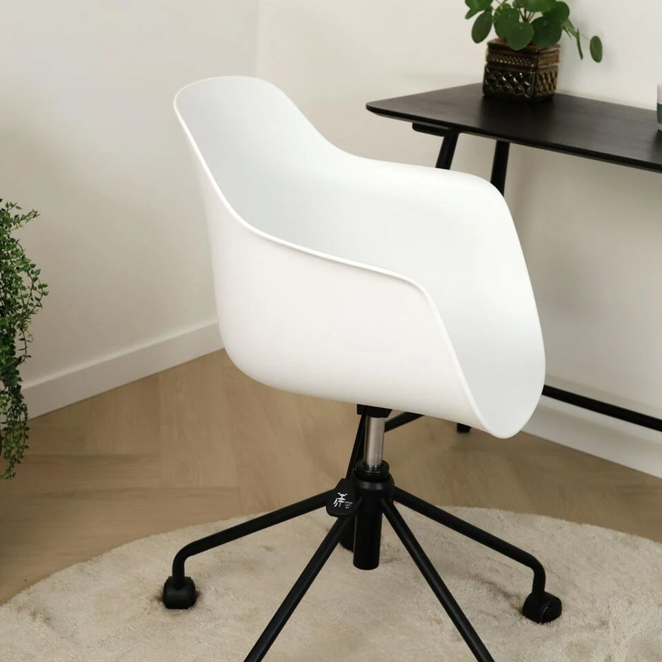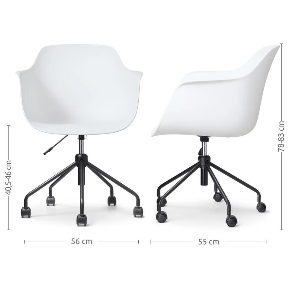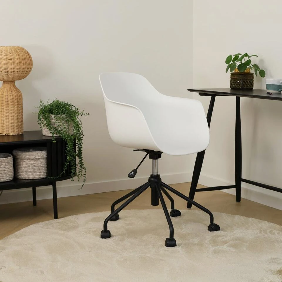 Deze moderne bureaustoel combineert een stoer en industrieel ontwerp met Scandinavische invloeden, waardoor hij naadloos in elk interieur past. De stoel is voorzien van een kunststof kuipzitting met armleuningen die optimale ondersteuning bieden tijdens lange werkdagen. Het metalen onderstel met zwarte poten is zowel stevig als functioneel, met een handige hoogteverstelling en een draaimechanisme dat 360 graden rotatie mogelijk maakt. Met een totale hoogte van 83 cm, een zithoogte van 46 cm en een zitdiepte van 46 cm, biedt de Nout-Puk voldoende ruimte voor comfortabel zitten. Verkrijgbaar in een mix van wit en zwart, deze bureaustoel is niet alleen praktisch maar ook een stijlvolle toevoeging aan je kantoorruimte.