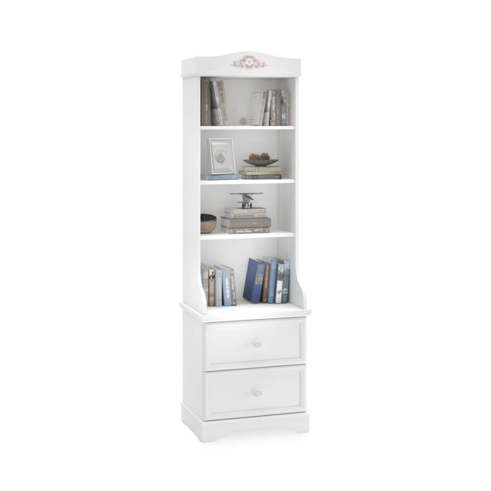 De Rustic boekenkast is een elegante witte kast speciaal ontworpen voor de meisjeskamer. Met vier ruime schappen en twee handige lades biedt deze kast voldoende opbergruimte voor boeken, speelgoed en decoratie. De sierlijke details geven de kast een romantische uitstraling die perfect past in een sfeervolle kinderkamer.