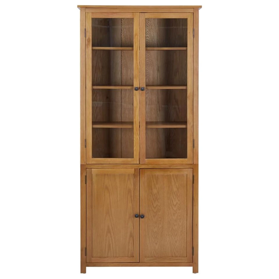 Deze boekenkast is vakkundig gemaakt van massief eikenhout en MDF, waardoor hij duurzaam en functioneel is. Hij beschikt over 3 schappen achter de 2 glazen deuren waarop je je verzamelobjecten, ingelijste foto’s, potplanten, enz. kunt plaatsen. Je kunt spullen zoals opbergbakken en tijdschriften op de 2 onderschappen achter de 2 houten deuren plaatsen en zo uit het zicht bewaren.